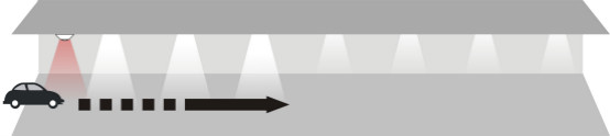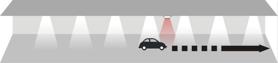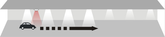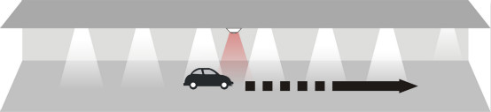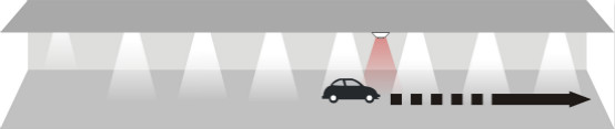 當汽車駛進停車場經過第一個PIR(熱釋電紅外傳感器),傳感器探測到有汽車進入,立即亮起車頭前方的3盞燈,燈的亮度客戶可以自行設置,設置范圍:50%~100%;
