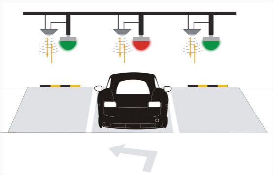 與此同時,停車場內指示燈亮紅燈和綠燈的數據傳送到控制中心,控制中心獲知空車位的占用情況,并反映在動態車位指導屏上。駕駛者根據動態車位指導屏可以知道空余車位的數量,并按照指示前往具有空車位的停車區。